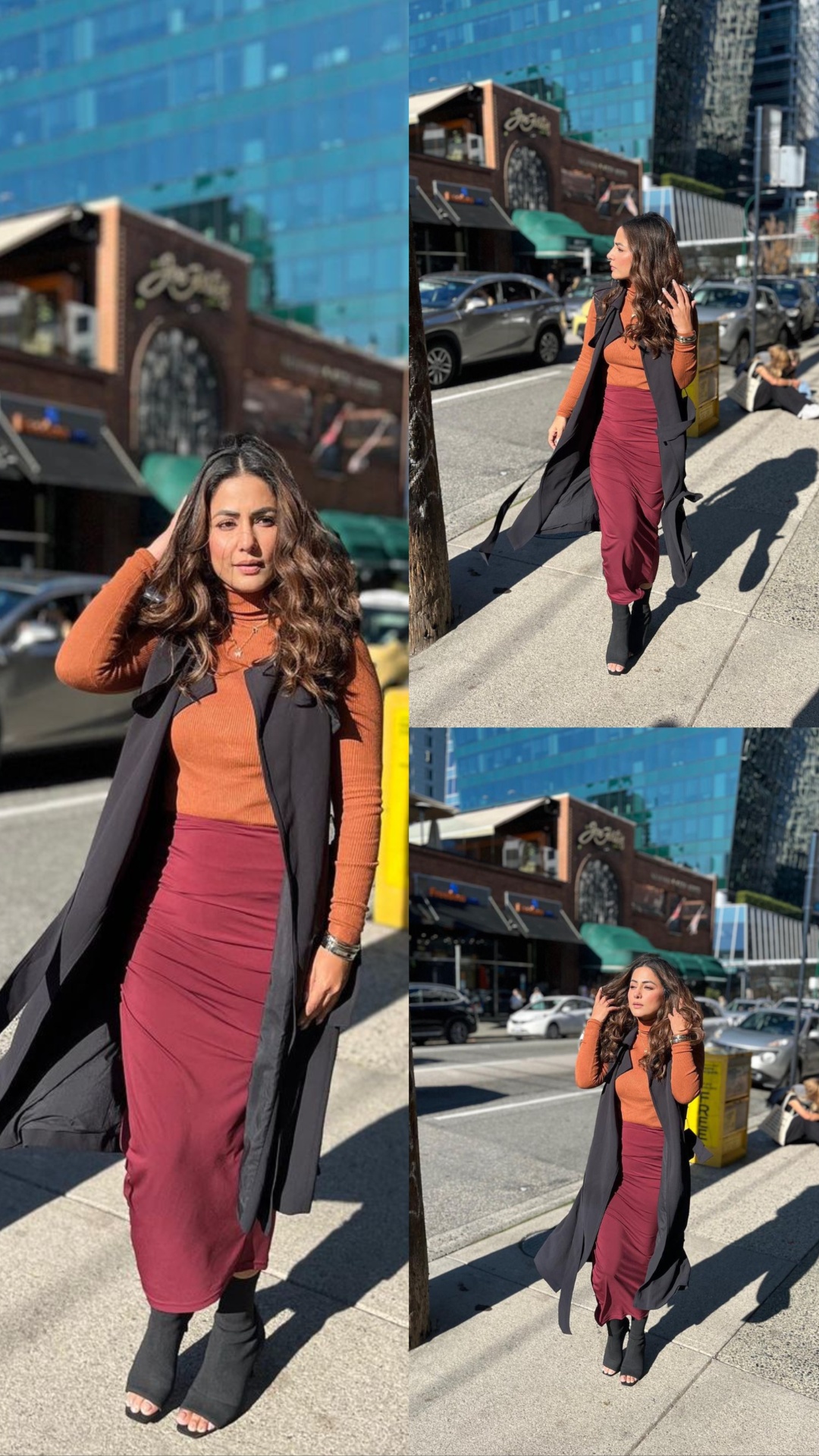 इन तस्वीरो में हिना खान ने मेहरून कलर का लॉन्ग स्कर्ट और ब्राउन टॉप के साथ ब्लैक जेंट्स पहना हुआ है।
