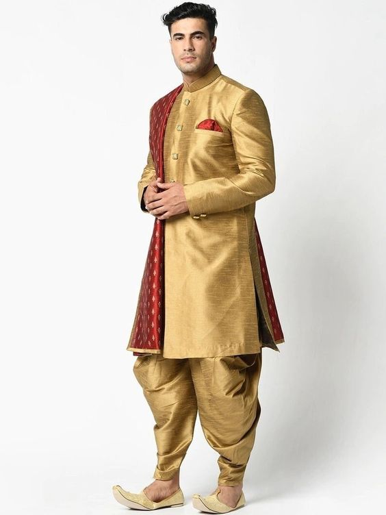 षष्ठी: यह कुर्ता-पायजामा, जोधपुरी या नेहरू जैकेट और जटिल मोजरी के साथ पारंपरिक सुंदरता का सुझाव देता है।